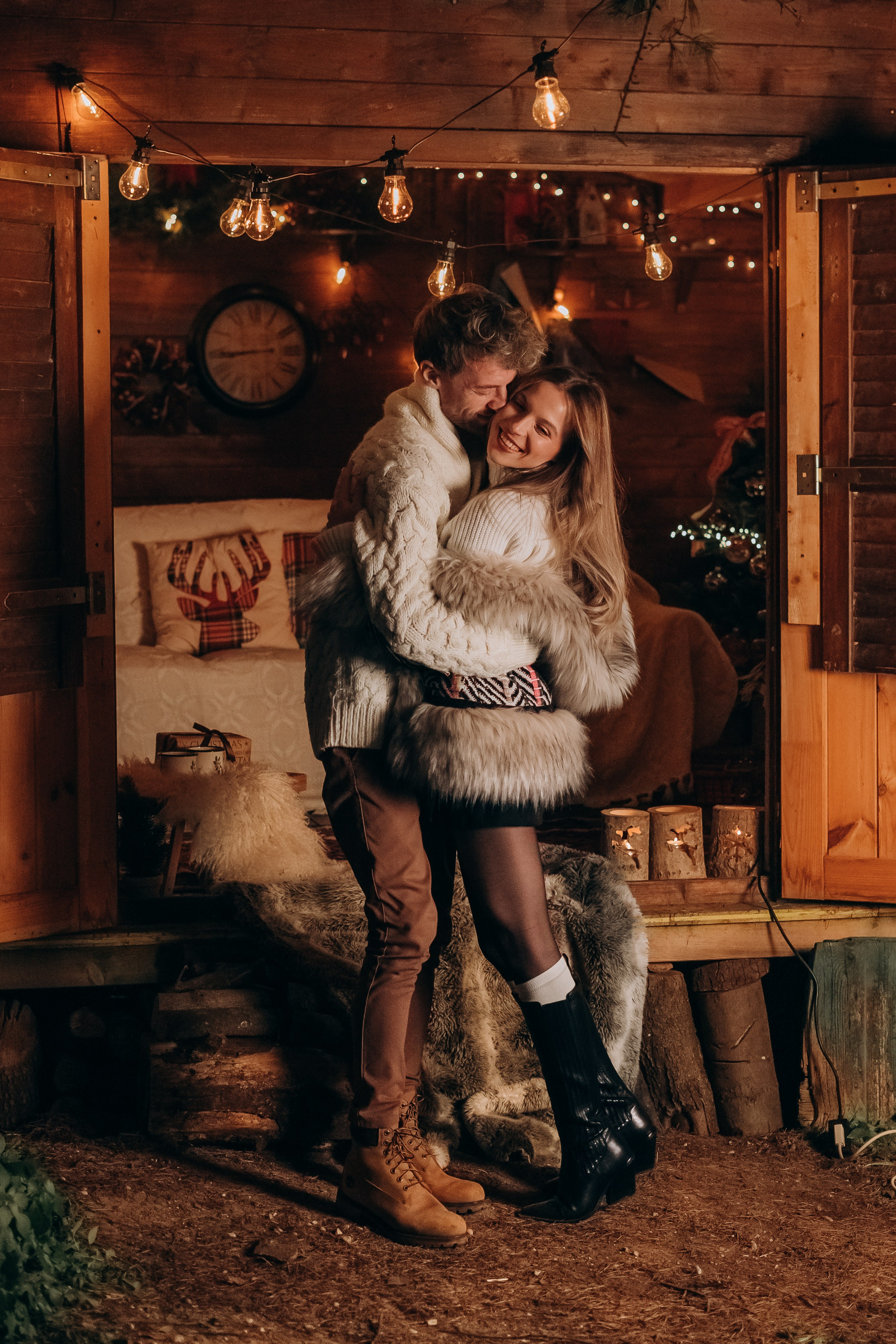Opta per abiti nei toni neutri o caldi, come bianco, beige, crema, rosso scuro o verde bosco. Questi colori si abbinano perfettamente all’atmosfera natalizia e risalteranno in modo elegante su ogni set.